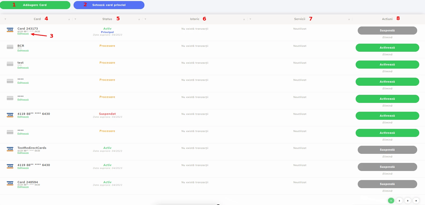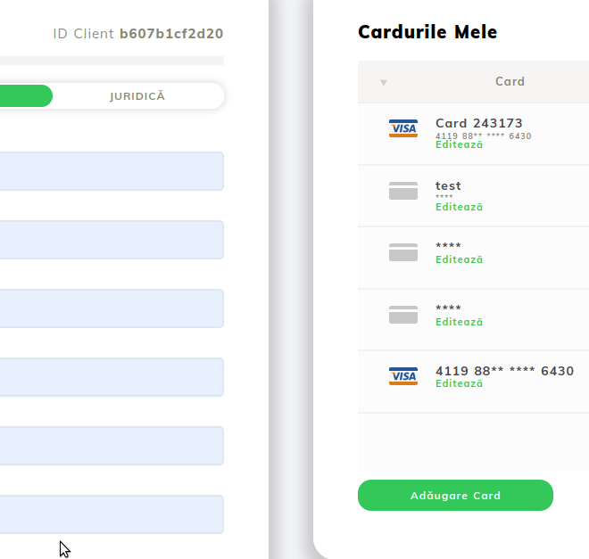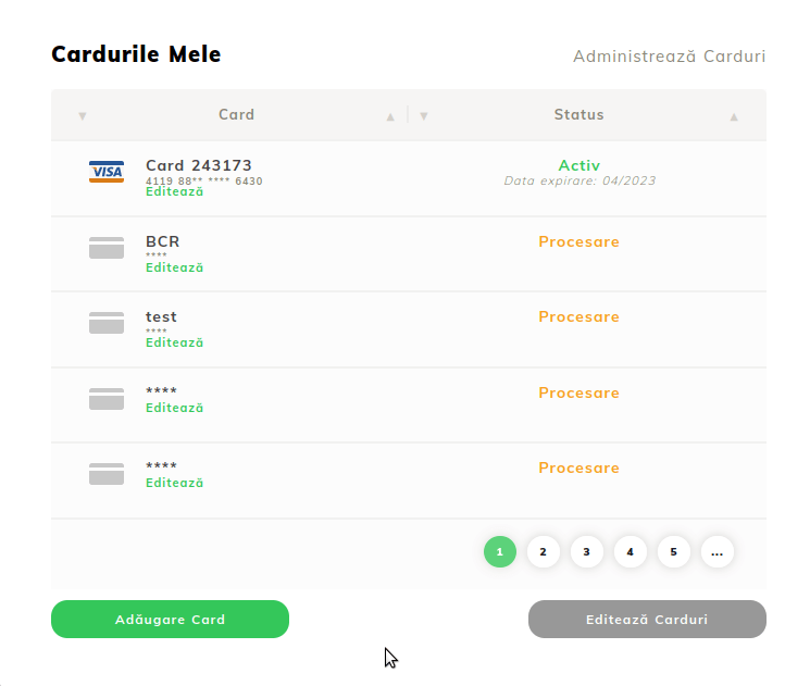 - Po pridaní karty analyzujeme rozhranie správy kariet v účte.