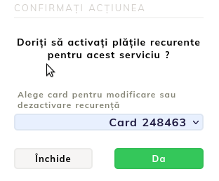 - Nové otvorené okno nás žiada, aby sme vybrali uloženú kartu v účte. Vyberieme kartu, z ktorej chceme, aby sa suma odúčtovala, a klikneme na ÁNO. Ak bola operácia úspešná, zobrazí sa správa "Opakovaná platba bola aktivovaná".