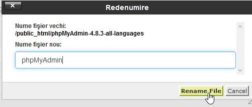 - v novom adresári s názvom príslušného archívu, ale bez .zip prípony, sa objaví v adresári public_html. Tento adresár je potrebné premenovať tak, aby zostalo len "phpMyAdmin". Premenovanie sa vykoná vybraním daného adresára a stlačením tlačidla "Premenovať" na lište v hornej časti stránky.