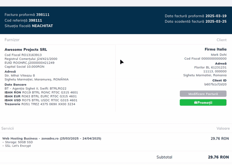 Prihláste sa do klientského účtu Hostico a prejdite do sekcie Finančné. Otvorte proforma faktúru, na ktorú chcete uplatniť kupón.