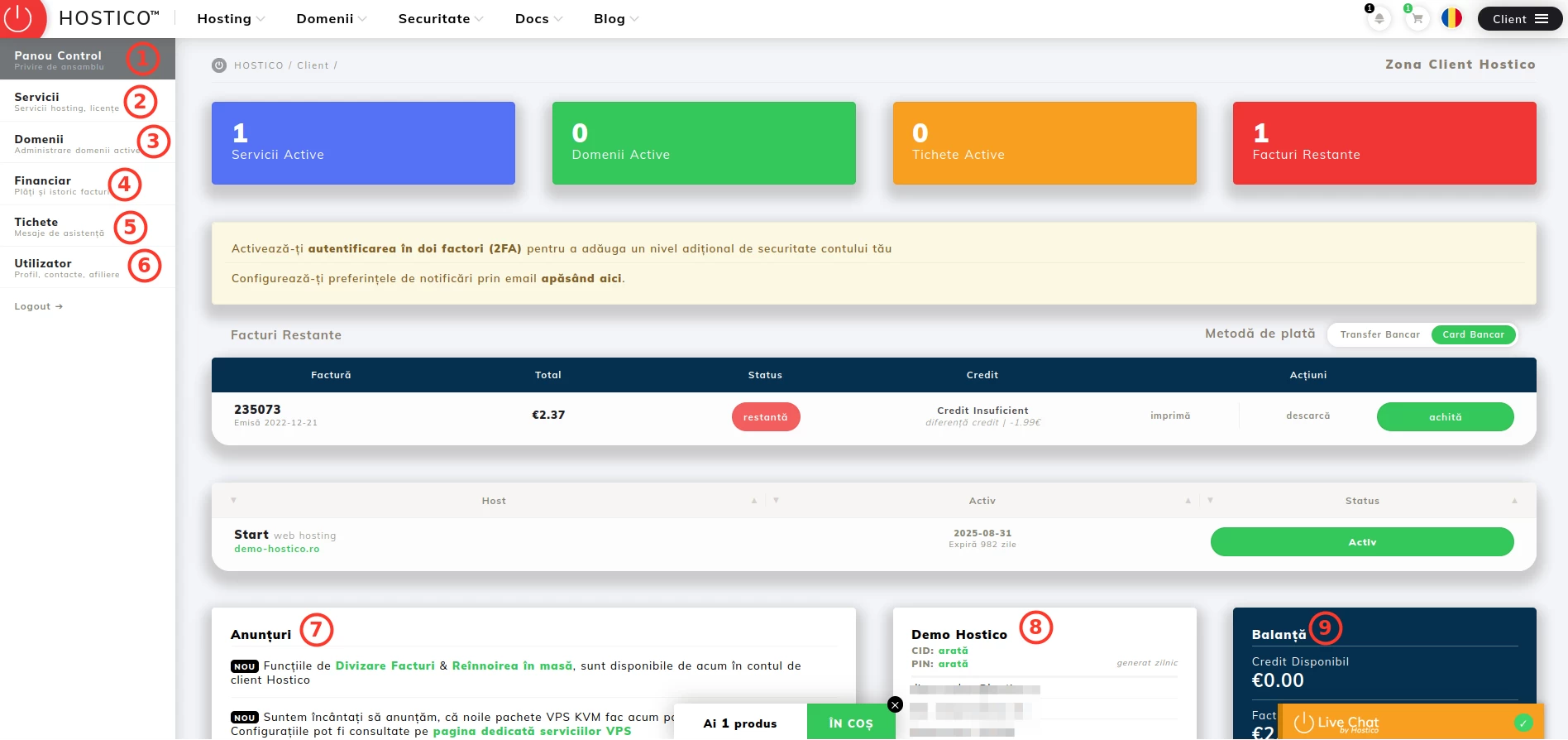 - (8) Hostico Demo - zobrazuje jedinečné informácie z účtu klienta, ako je ID alebo PIN kód;