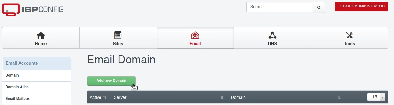 - ISPConfig ponúka možnosť vytvárať emailové schránky spojené s vlastnenými doménami. Pre vytvorenie emailových schránok bude potrebné najskôr pridať doménu v paneli, v menu Doména pod kategóriou Emailové účty.