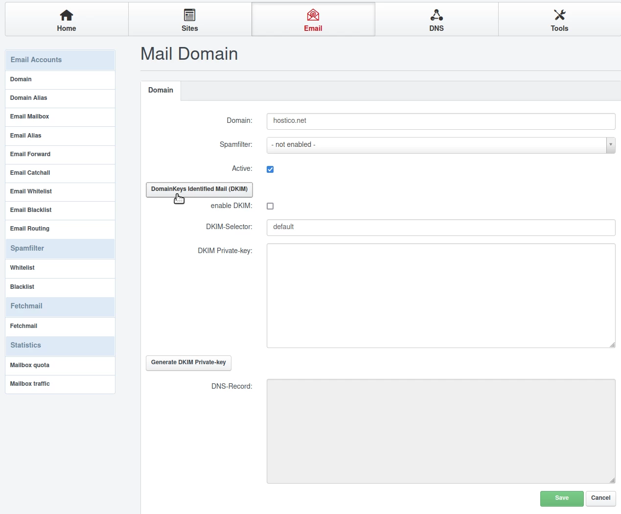 - Aktívne: Necháme zaškrtnuté políčko; Ak chceme nastaviť aj DKIM (ochrana pred spamom/phishingom), klikneme na tlačidlo DomainKeys Identified Mail (DKIM); Odporúča sa prejsť aj týmto krokom;