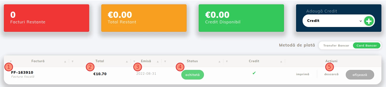 - Na ďalšej stránke sa zobrazia existujúce faktúry v účte klienta a ich stav.
