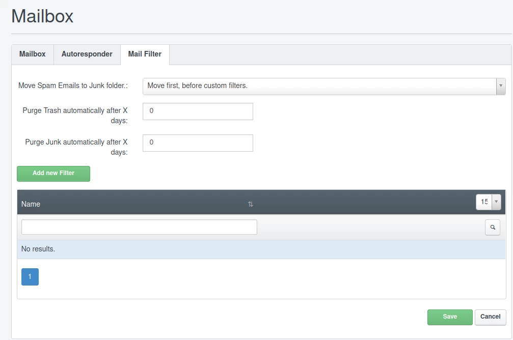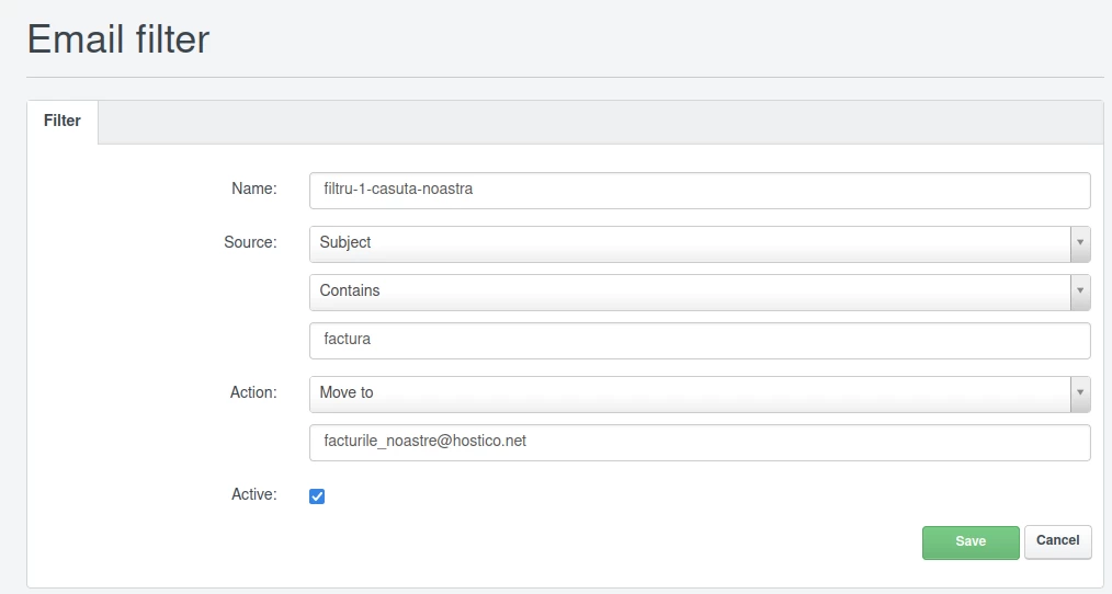 Na karte Filtrácia pošty môžeme nastaviť prispôsobiteľné dodatočné filtre pre emailové správy zaslané do poštovej schránky, ktoré sa automaticky spustia predtým, než sa dostanú do priečinka Doručená pošta, a vykonajú rôzne konfigurovateľné akcie z tlačidla Pridať nový filter.
