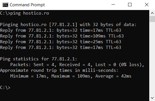 V našom príklade vidíme, že IP adresa spojená s doménou hostico.ro je 77.81.2.1.